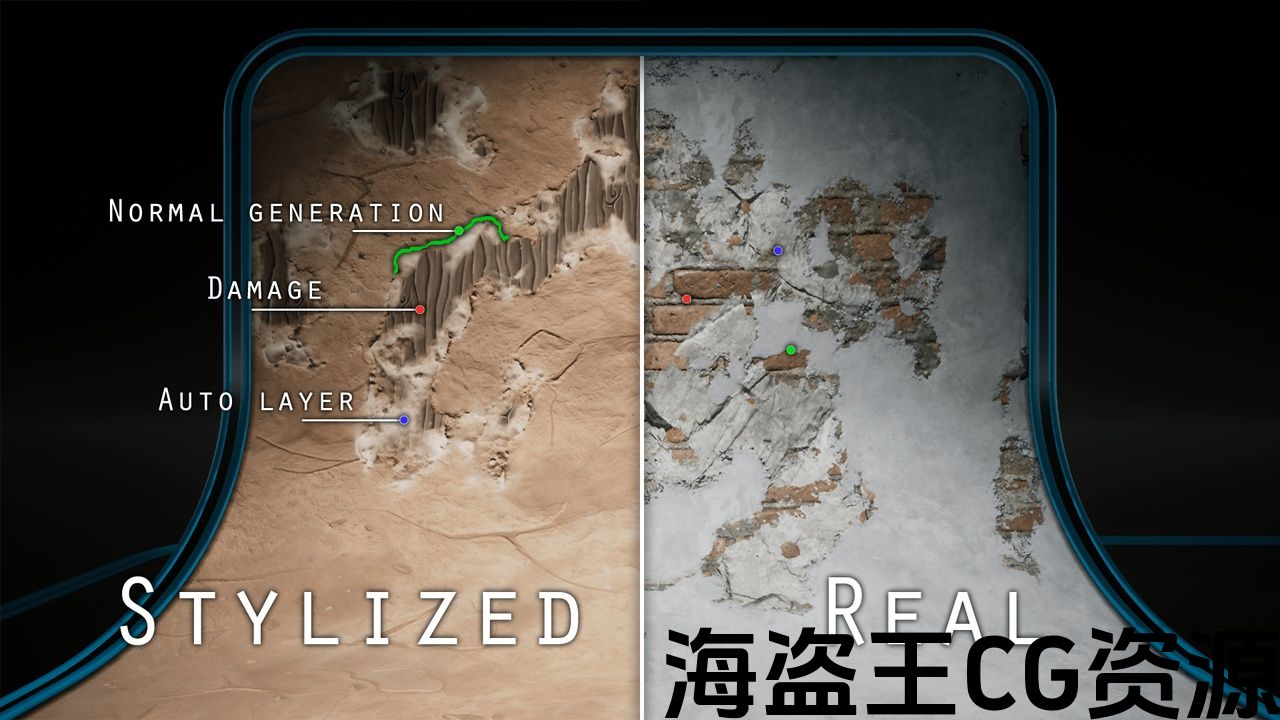 您可以绘制,以及在模型上自动创建以下内容: , 水坑, 流下来的水, 污垢, 苔藓 和其他喷洒在 顶部,或在所选 侧面, 自动的手动操作,+连接 三联体,三联体. 也有 破坏,破坏半自动化 模式,或手动,以及 法线的生成 沿边缘从高到低的过渡。 插件 大型物体的细节。 所有blendings进行根据 高度图 的相应层。