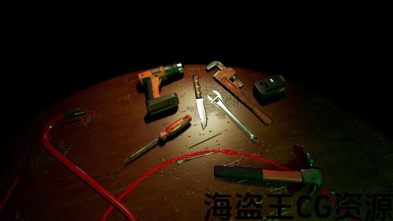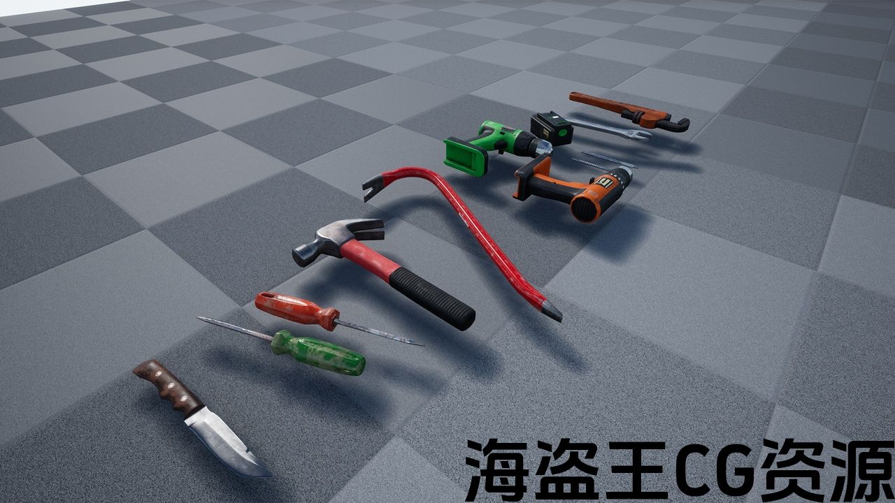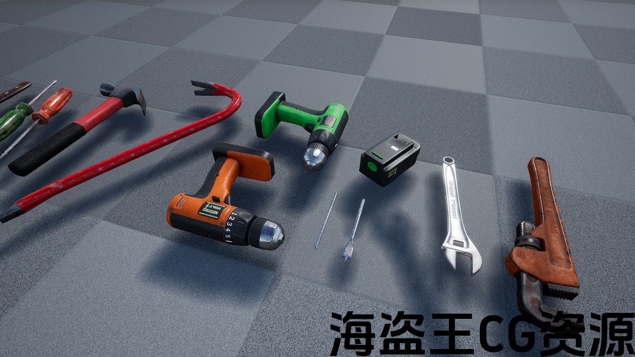 特点:钻头,钻头电池,螺丝刀,撬棍和锤子有可定制的基础颜色通过材料实例参数。 具有可自定义颜色的网格体也有一个污垢层的切换。