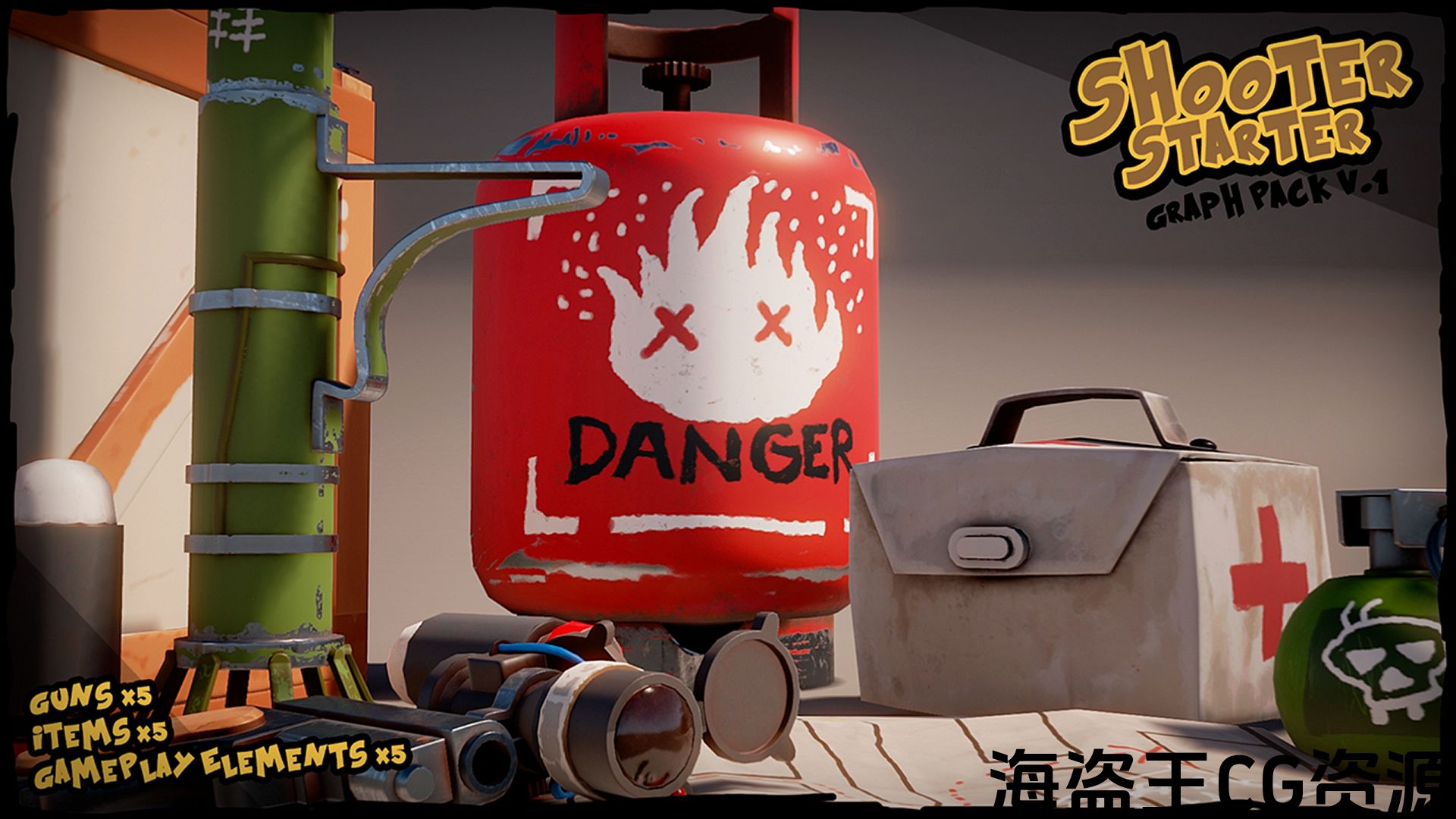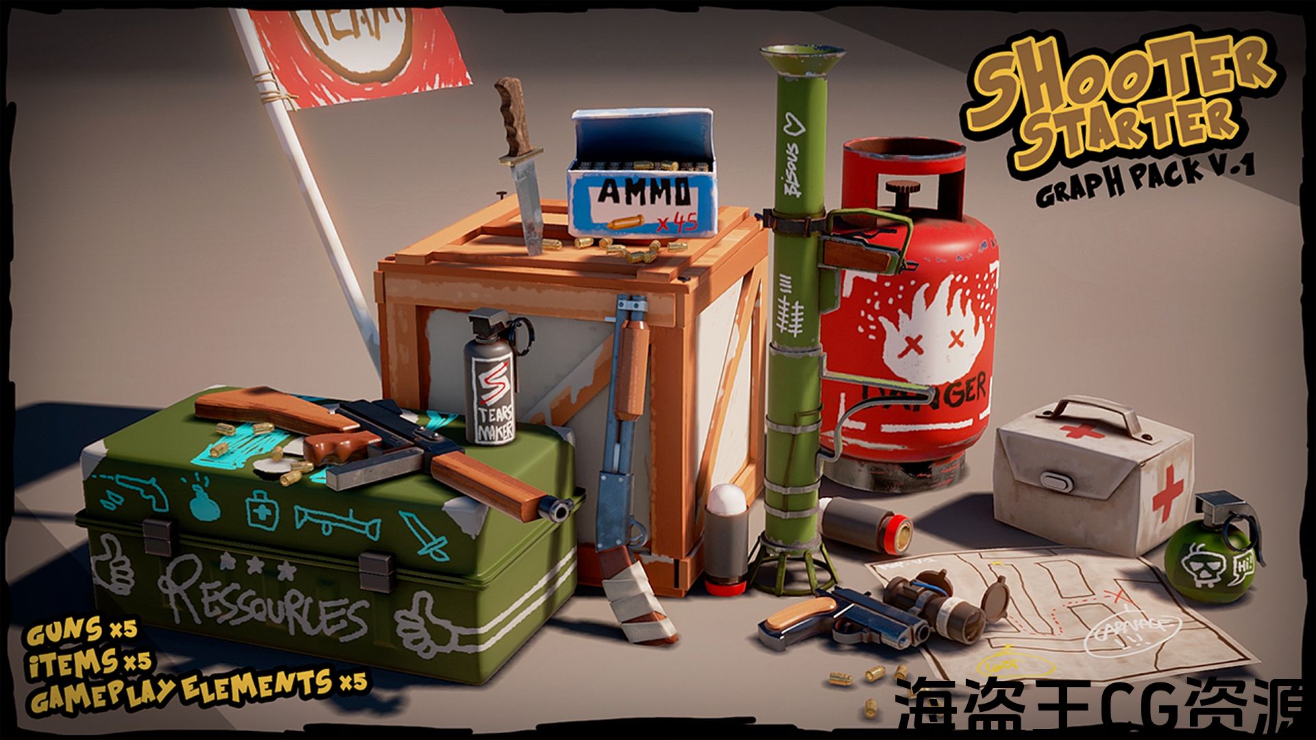 The Shooter Starter Graph Pack include 5 weapons, 5 items and 5 Gameplay Elements.