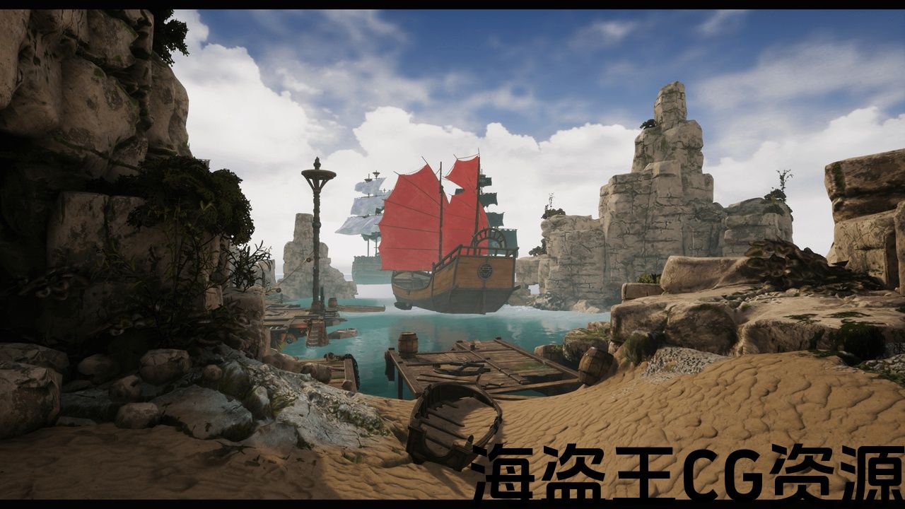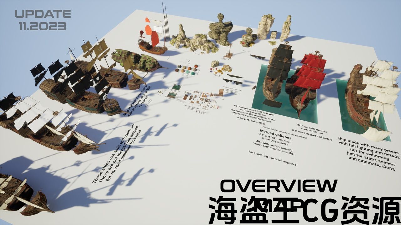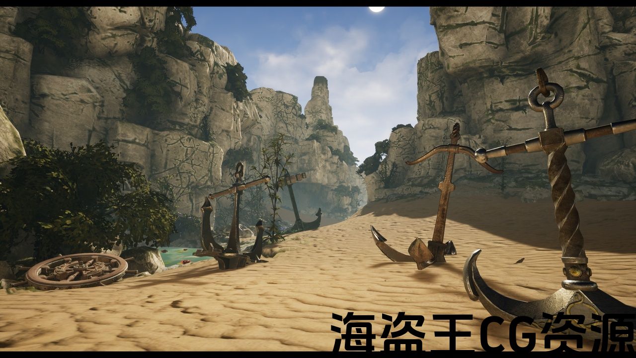 - 192道具:锚,方向盘,帆与布模拟和帆与预烤动画(闲置,强风,furling),船,树叶(灌木,花卉,水草,竹子,草),岩石(几种类型),珊瑚礁网格,木制资产(桶,饰条,柱子,桅杆。..)、渔网、大炮、玻璃球、绳索、金属格栅等,