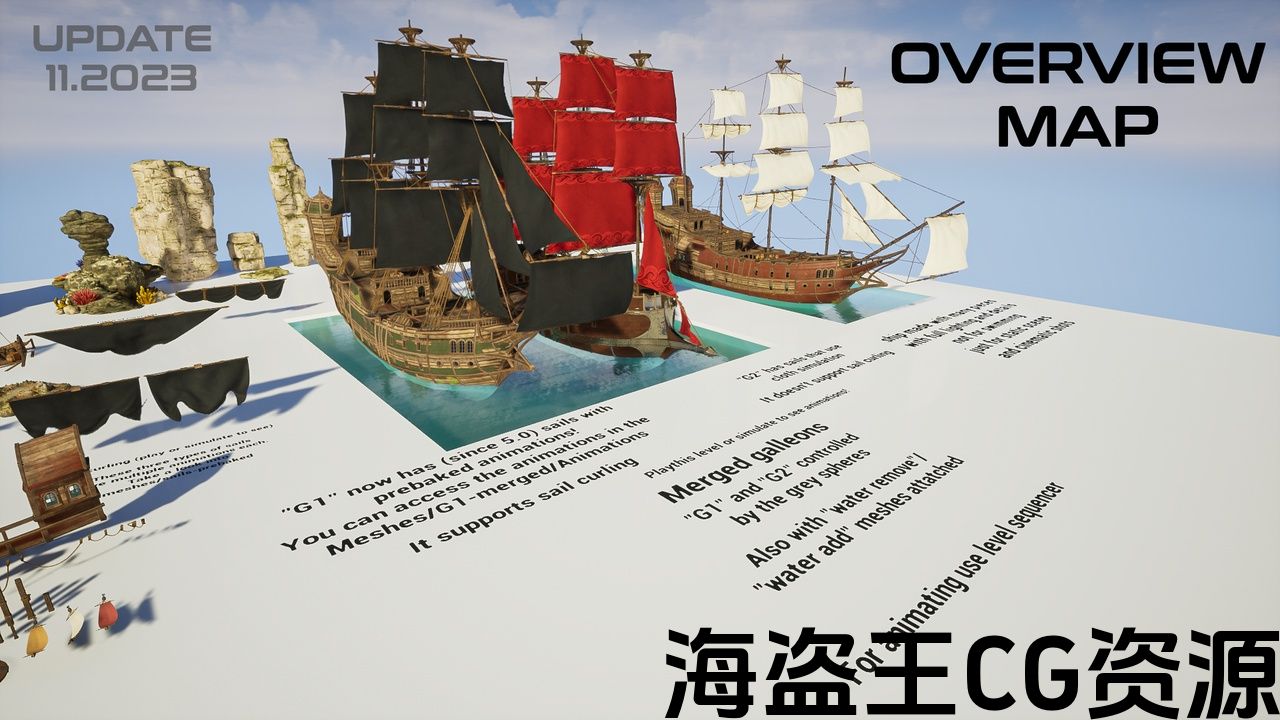 - I have updated the pack so sail curling is now an option. Apart from the cloth simulated sails there are now separate sails situated in the Meshes\sails-prebaked. Those have prebaked animations – to make them loop seamlessly – overlap the animations in sequencer (UE will interpolate transitions smoothly). For the merged galleon (only G1) – Make sure to use "G1_rigging_new" skeletal mesh (Meshes\G1-merged). It has multiple pre-baked animations (Meshes\G1-merged\Animations) that start with "anim_G1-…". If you want to keep sails folded – use the "anim_G1-new_rig_folded-POSE" or for the individual sails look for the animations with "-folded" in the name. Check the overview map for the examples.