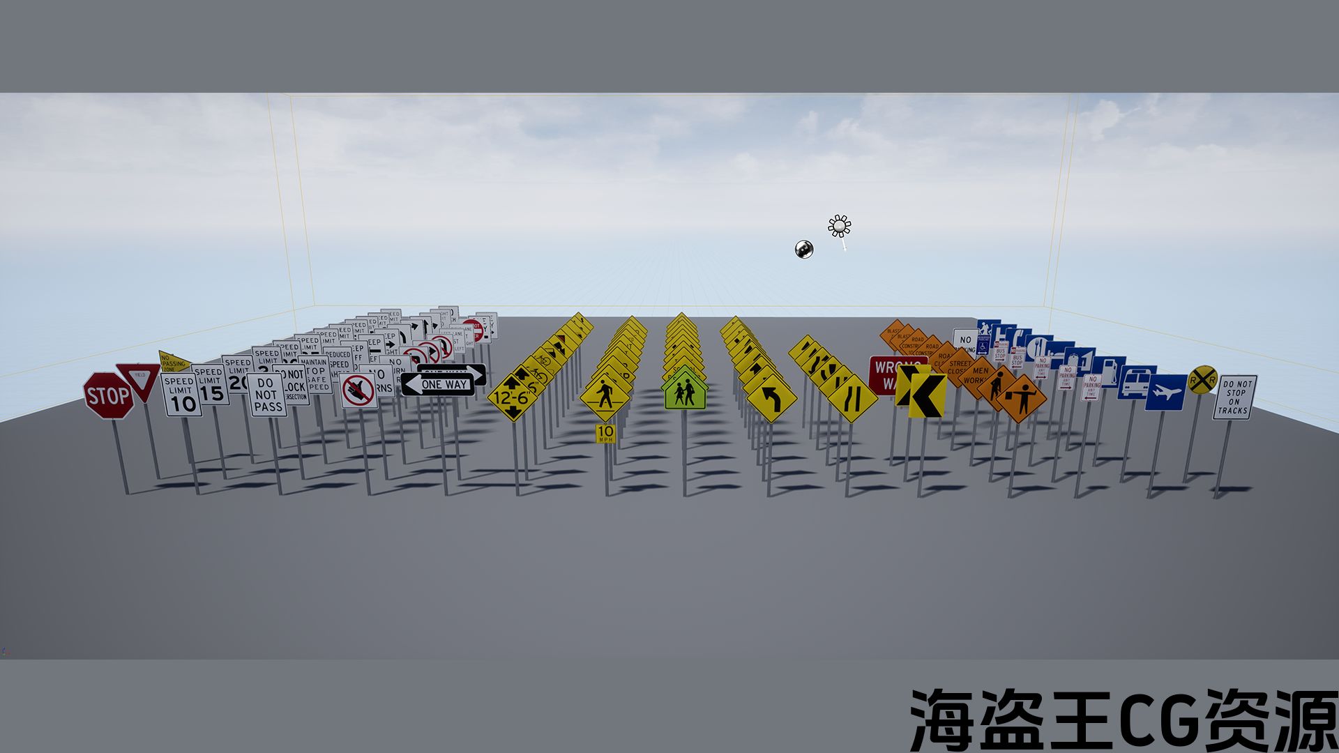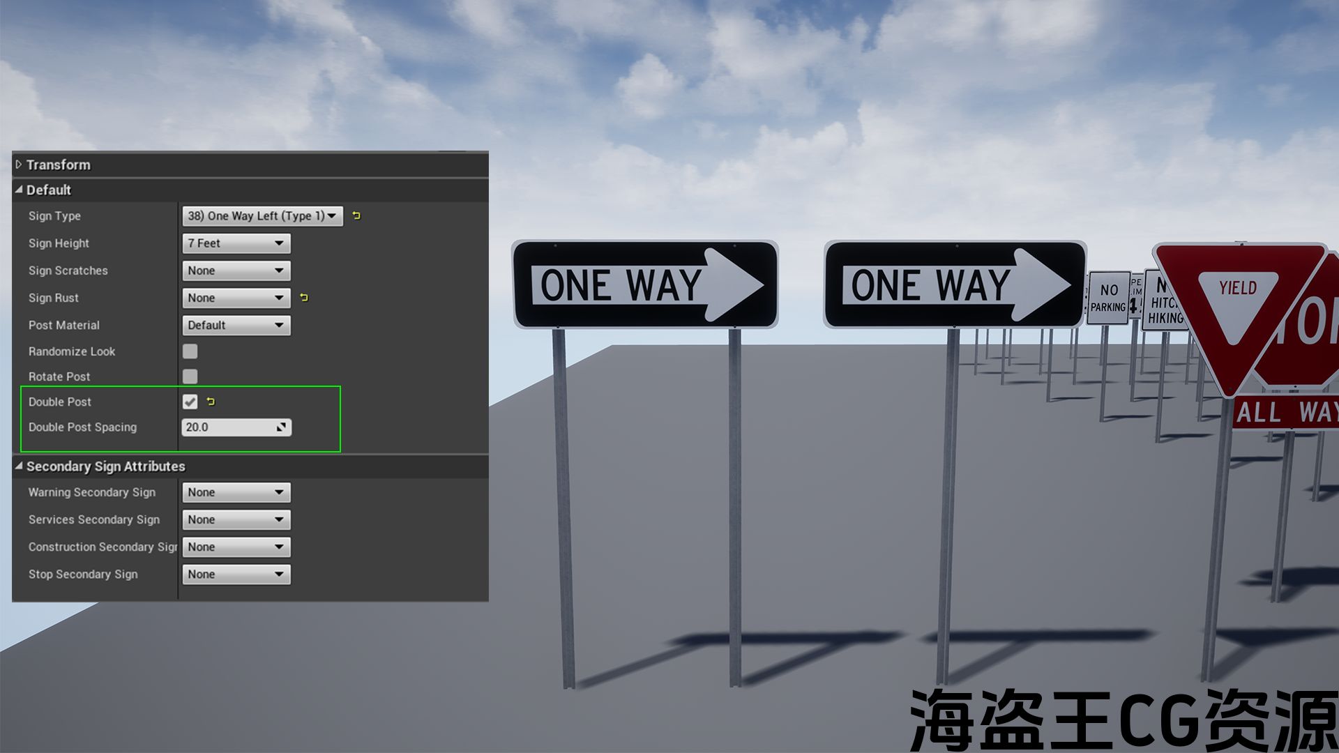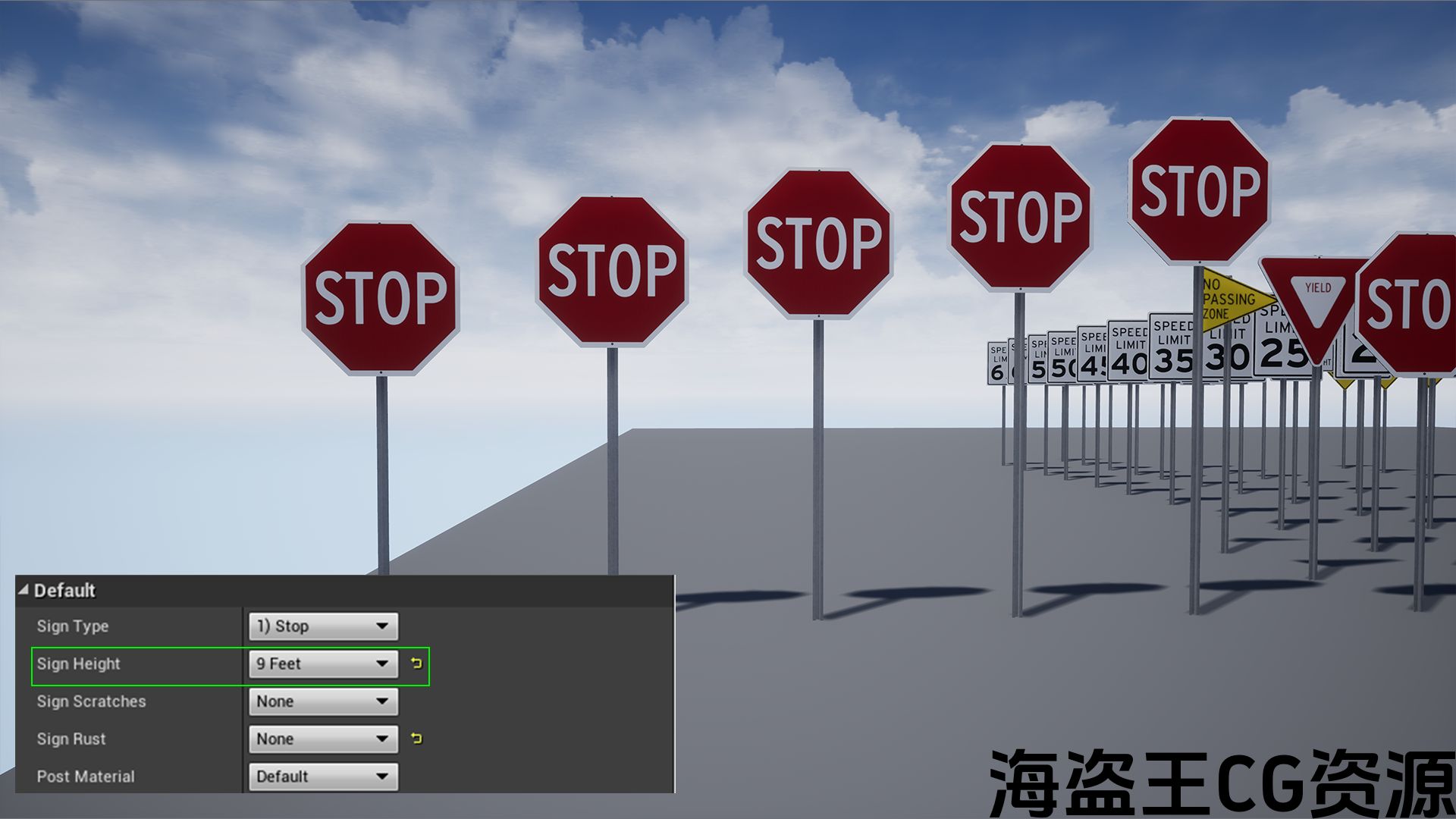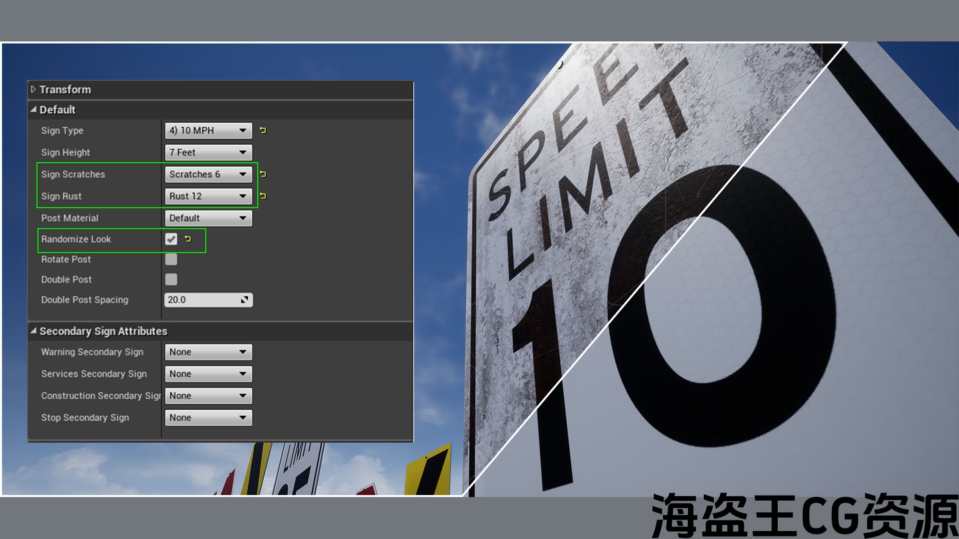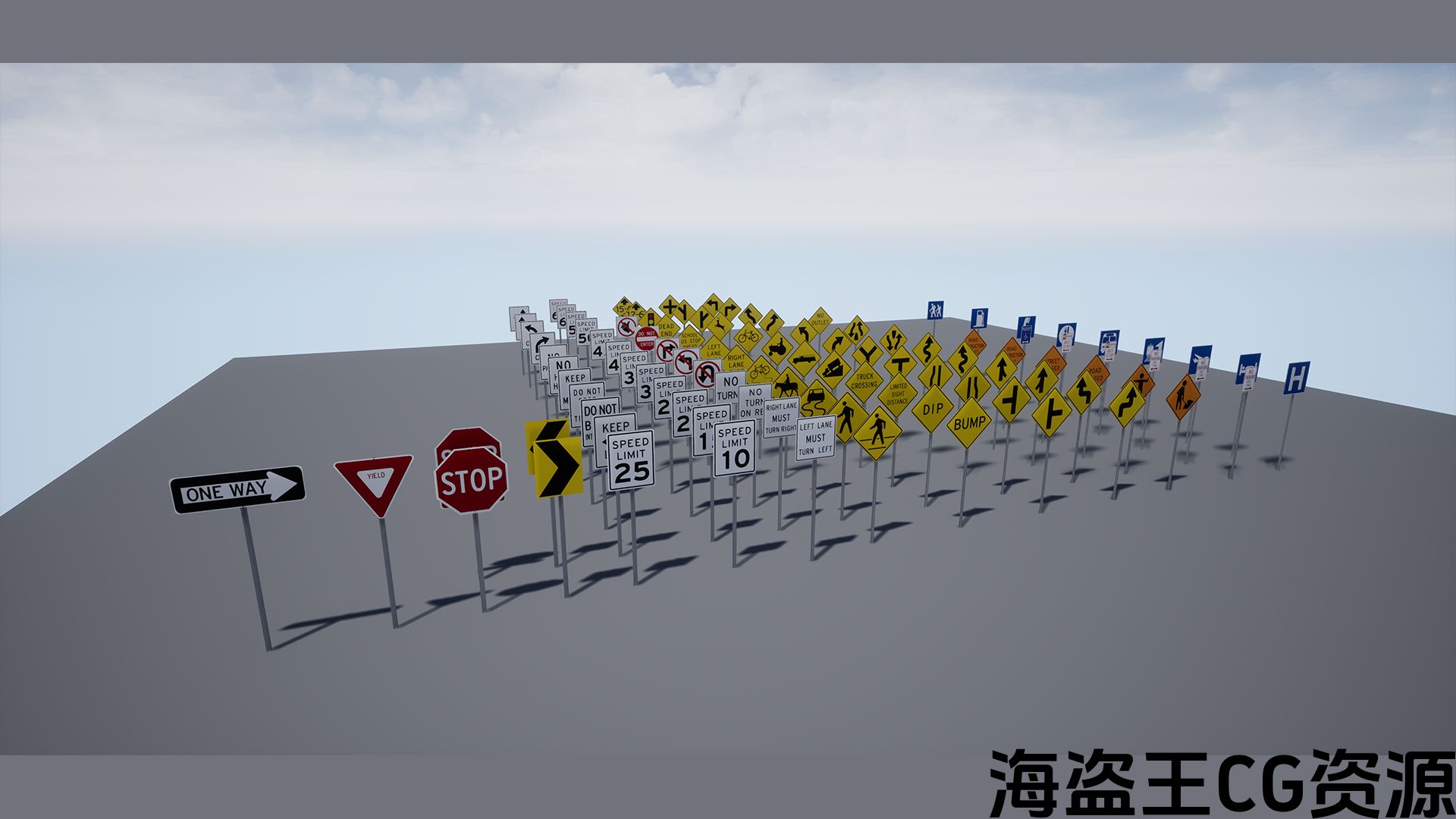 此标志包由一个蓝图驱动。 只需将其拖动到您的关卡中,在详细信息面板中,您将看到标志类型,高度,锈蚀,划痕,双/单柱,柱旋转等选项。 有些标志有辅助标志的选项,它将作为主标志下面的第二个标志出现。 即,黄色钻石(警告)标志有一个下拉,可以让你添加不同的推荐速度限制。 有超过100个标志和400个外观变化,这个包将一定适合任何项目需要路标。