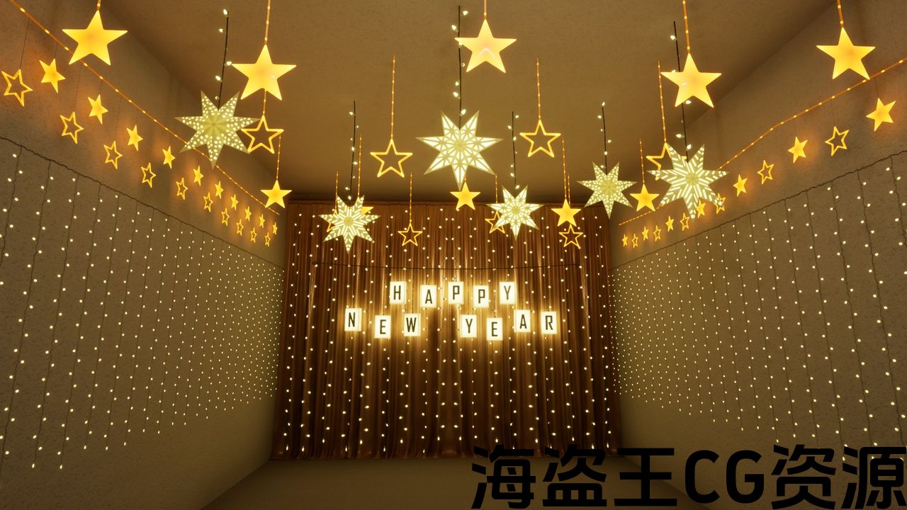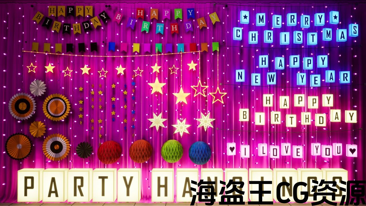 一套适合聚会和活动的室内吊架. 包括挂纸,横幅,发光的星星,花环和背景,以创造完美的庆祝环境。
