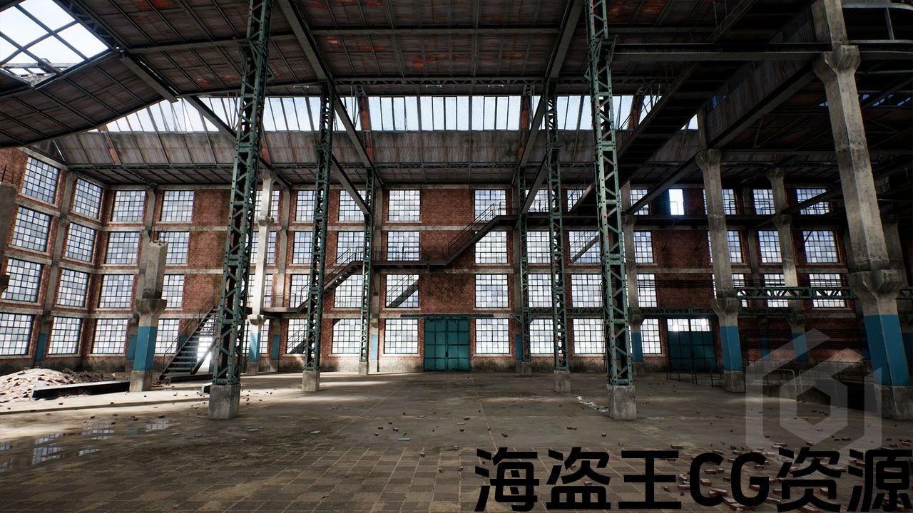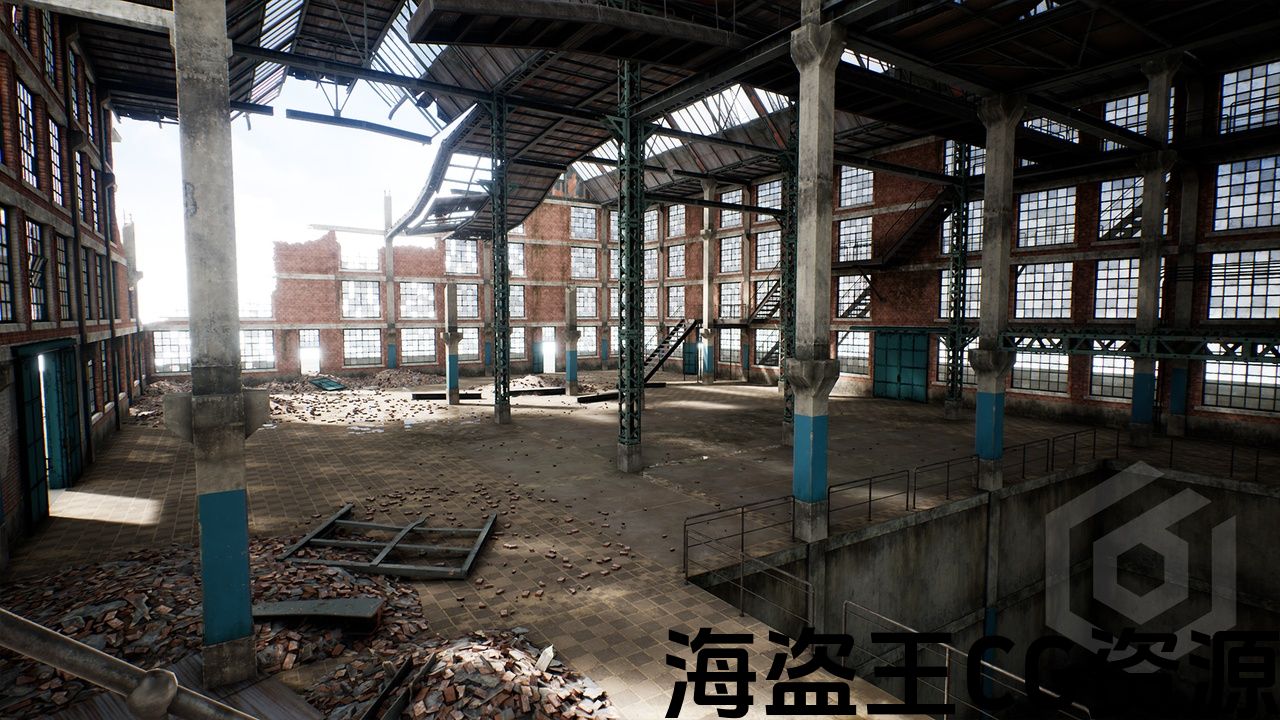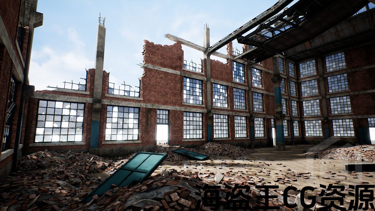 工厂废墟模块化道具,1940年建筑风格。 模块化墙壁,窗户,人行道,门,金属屋顶,混凝土支柱和横梁。