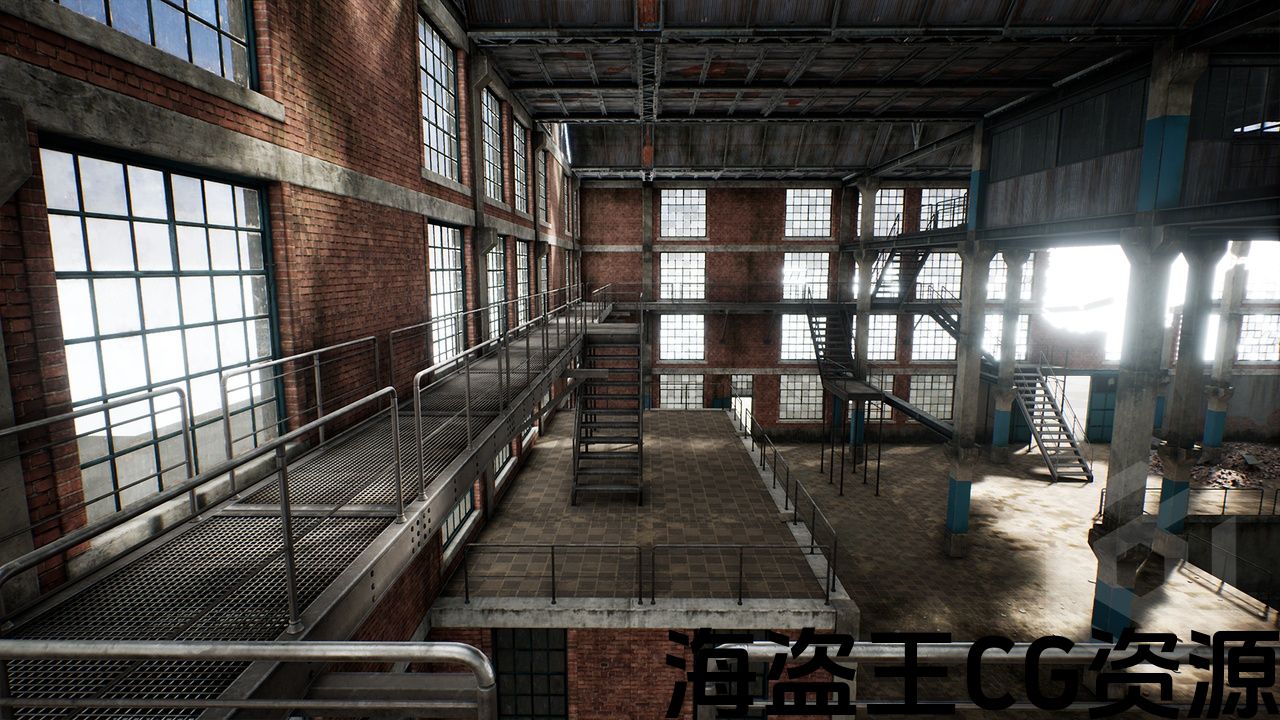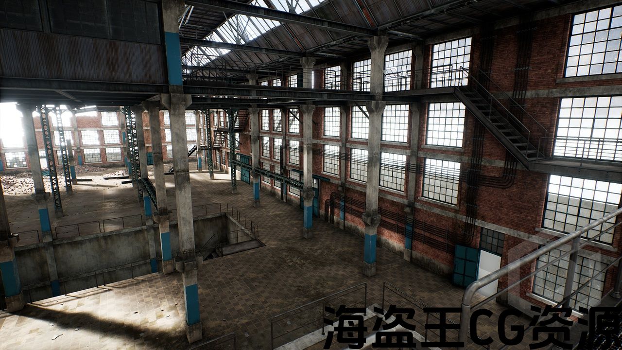 Factory Ruins modular props, 1940 architecture style. Modular walls, windows, catwalks, doors, metal roofs, concrete pillars and beams.