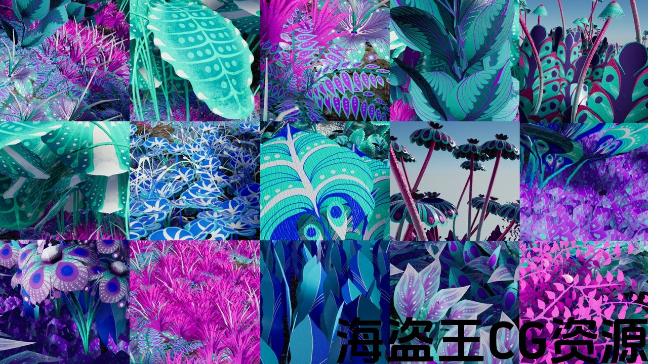 A set of fantasy plants illustrated by hand. Different sizes and colors ready to create a pleasant dreamlike environment.