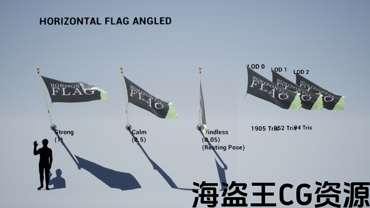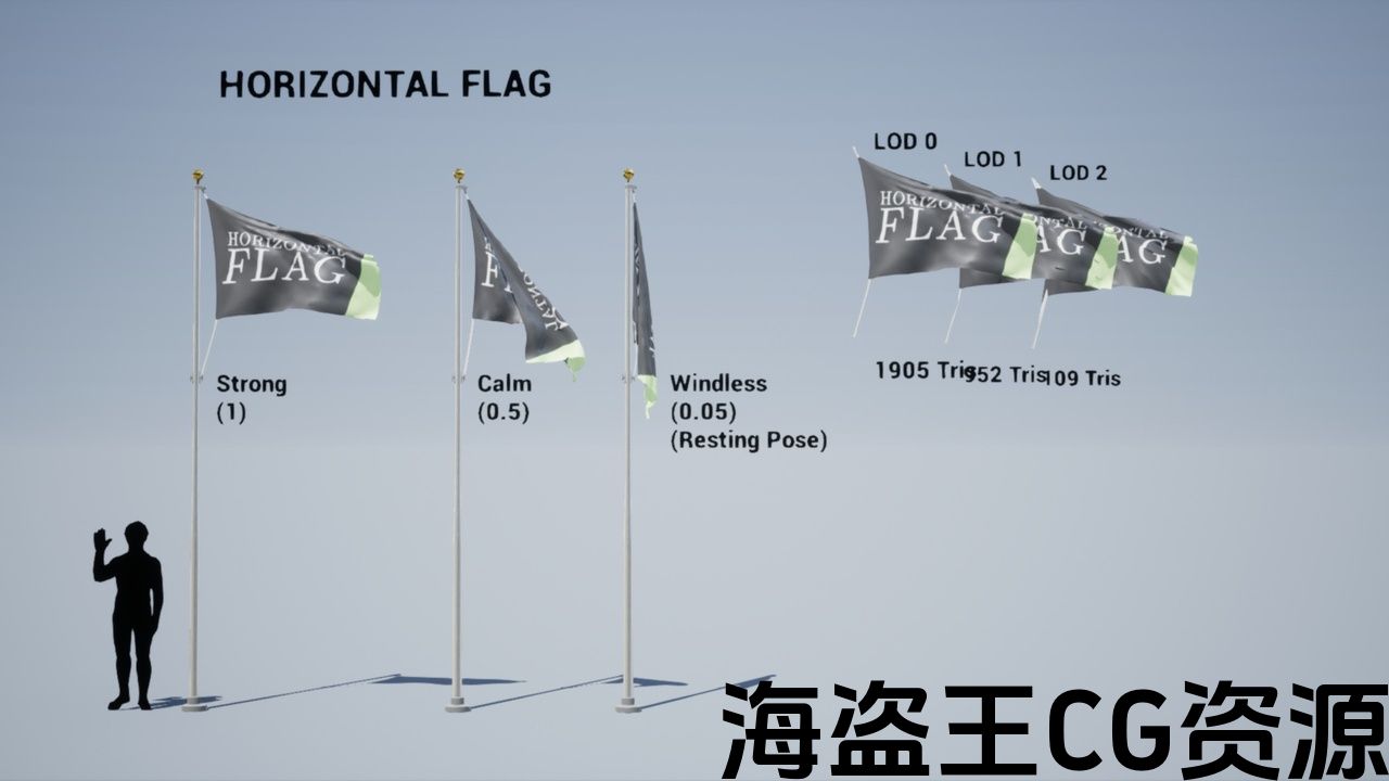 The wind strength of the flags can transition between windless (a resting pose) to calm, to heavy.