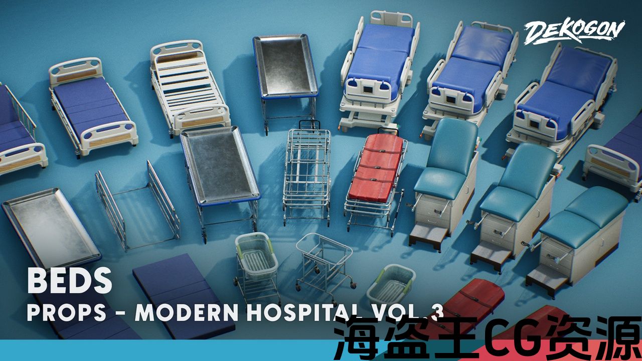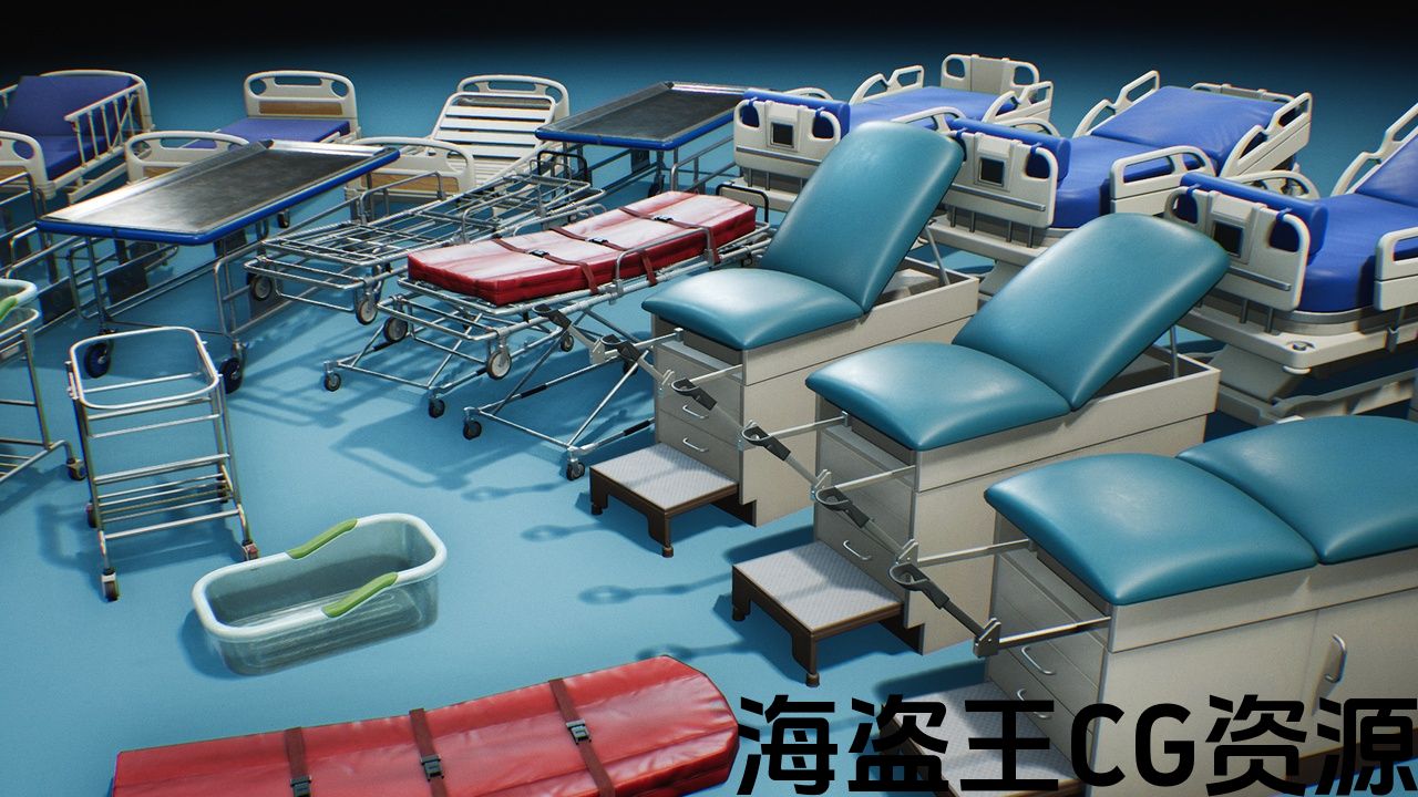 Includes multiple hospital type beds and gurneys, all with multiple parts or single simple static mesh.