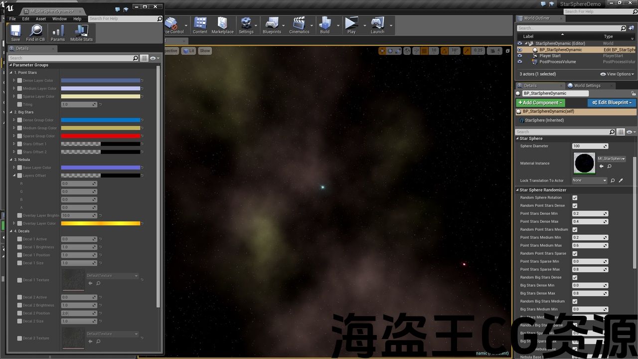 Static StarSphere uses 8 adjustable layers with 6 decal positions. You can lock sphere translation to actor and align sphere rotation to directional light source.