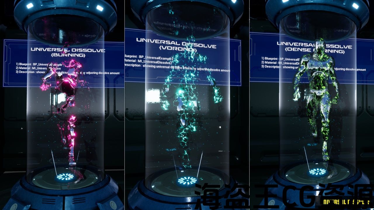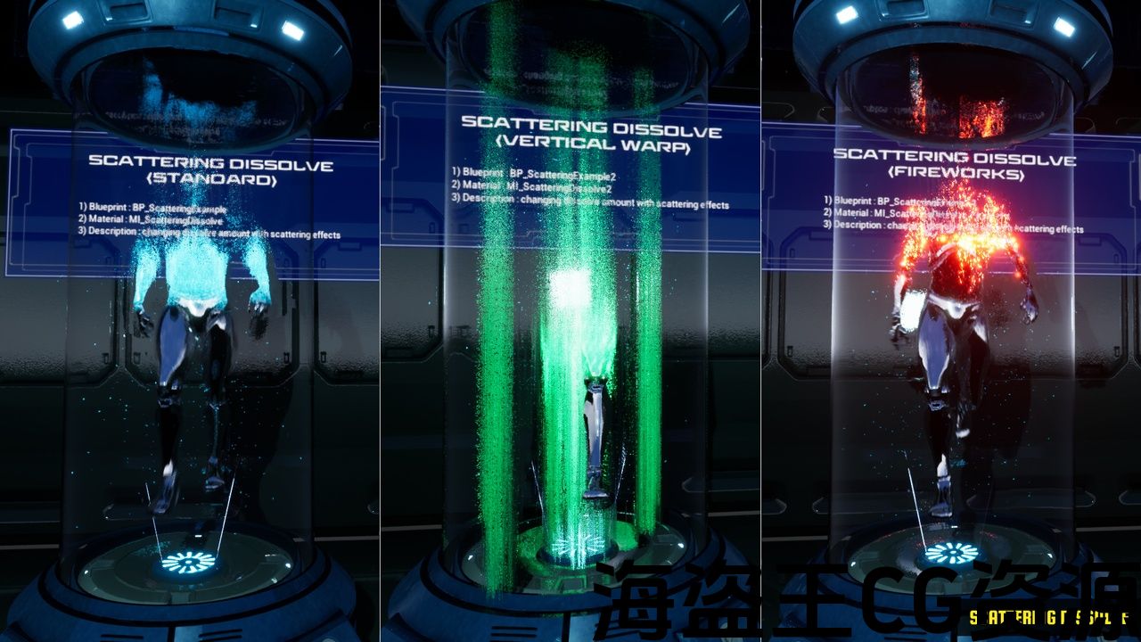 We are pleased to release an update of Dissolve VFX Pack. Dissolve VFX Pack is dissolve related visual effects and materials. Our latest release includes 26+ Dissolve VFX examples with dynamic material interactions, 34+ dissolve materials and material instance (circle masking, reverse circle masking, glitch, scattering, universal, vertical, warp), 8+ Material Functions, 4+ Sci-Fi level design modules and 2+ display models. With this pack, we believe you can easily customize new materials and material instances set.
