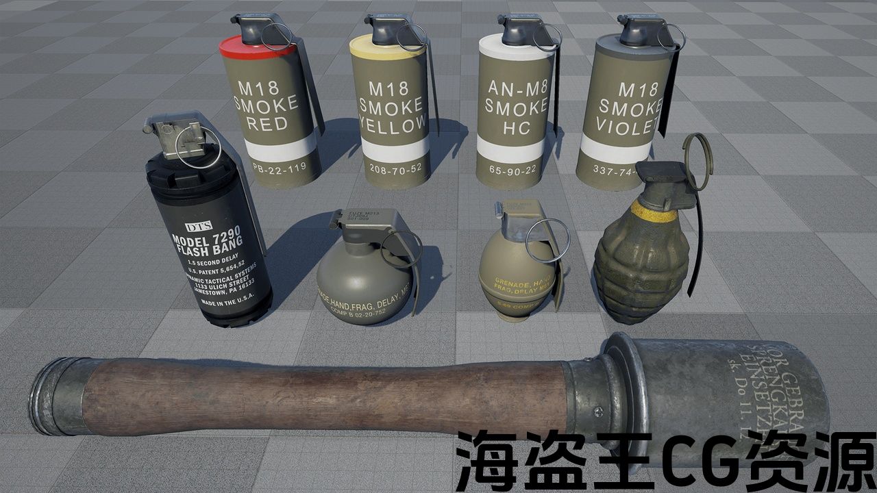 包包括•*M61碎片手榴弹•M67碎片手榴弹•MK2碎片手榴弹•型号24手榴弹•M18烟雾手榴弹•Flashbang手榴弹所有型号都在2k和10k顶点之间,具有4k纹理。 提供了一个包含烟雾手榴弹资产的材料实例的主材料