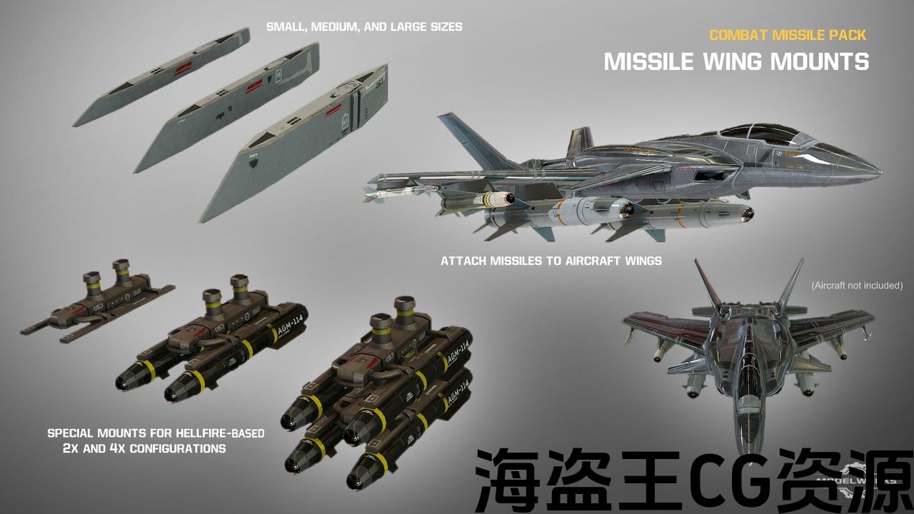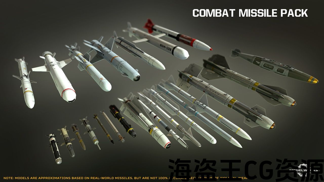 战斗导弹包包括五类(空对空,空对空,地对空,地对地和炸弹/火箭)的23枚导弹。 导弹是按比例建造的,是基于现实世界导弹的近似值,但颜色和细节略有修改,不能准确地复制现实世界中的任何武器。包括3种尺寸的通用机翼支架,将导弹安装在飞机机翼上。 还包括一个特殊的可堆叠安装的地狱火基导弹在2x和4x配置。
