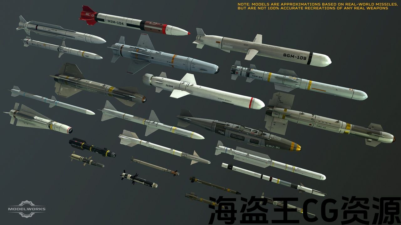 – 2048×2048 textures; Base Color, Normal, Metallic, and Roughness maps – Missiles are grouped into texture sheets by category (AAM, ASM, SAM, etc) – Models are generally 1000-1800 trisScaled to Epic skeleton: No Physically-Based Rendering: Yes Texture Size (please list textures for each resolution): 2048×2048 Base Color, Roughness, Metallic, and Normal Collision: Yes, custom and auto-generated Vertex Count: 800-1800 tris LODs: No Number of Meshes: 27 Number of Materials and Material Instances: 6 Number of Textures: 24 Engine Compatibility: 4.15 Intended Platform: Desktop Platforms Tested: PC Documentation Included: No