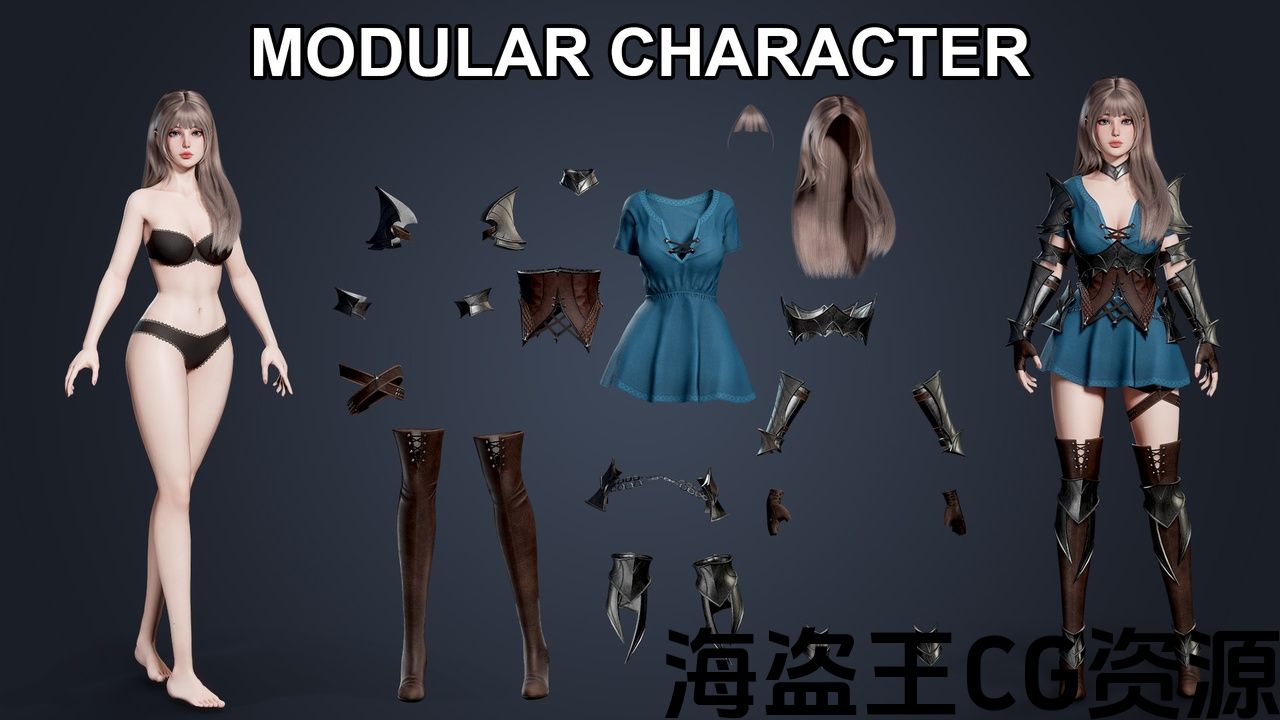 - Character is modular. Separated Meshes for Master Pose / Leader Component. Includes separated parts of body and full body without cuts, head, hair and clothes parts.
